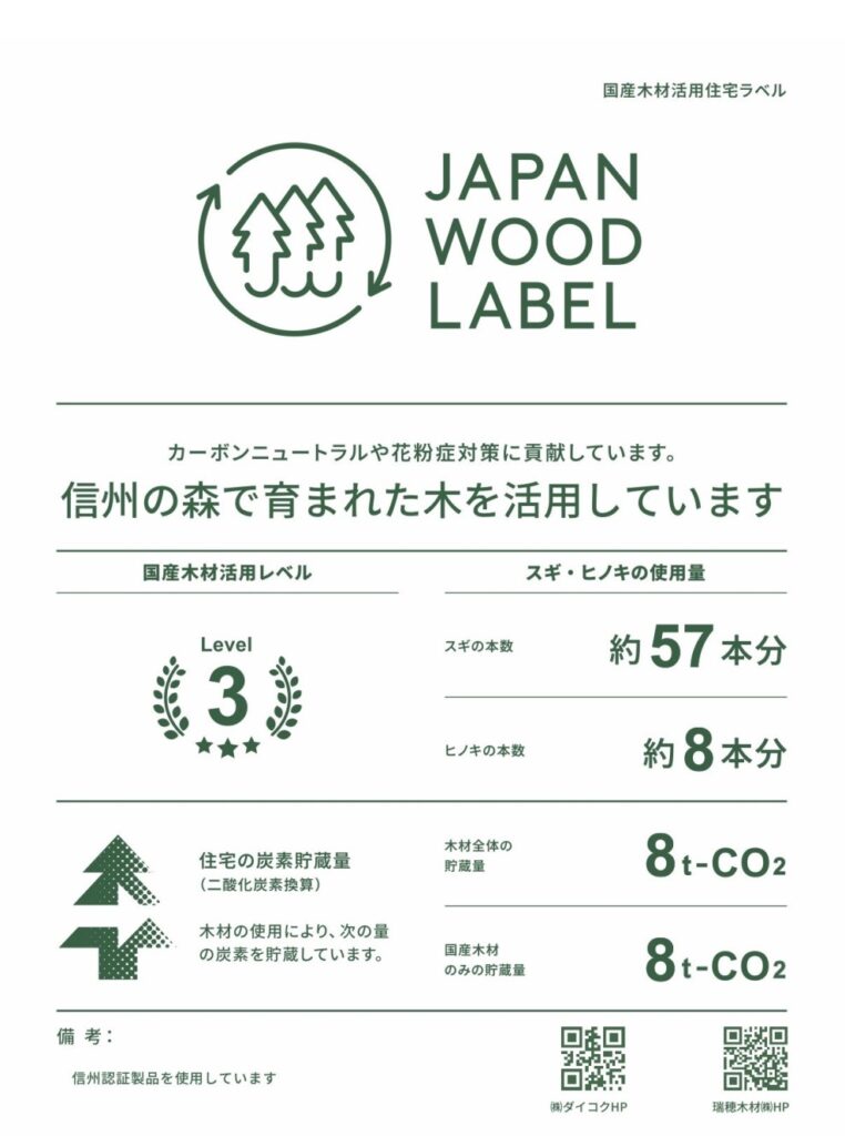 国産木材活用住宅ラベルといって、環境貢献度を1~3段階で評価されています。二酸化炭素の問題だけではなく花粉症対策の一環でもあるようです。