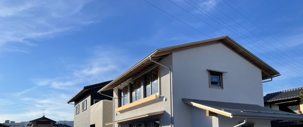 3寸5分勾配の大らかな切妻屋根のかたち、そして北側のお住まいに配慮した建物の高さ、目地のない左官の手による白壁、この潔い佇まいは毎度のDAIKOKUスタイル。