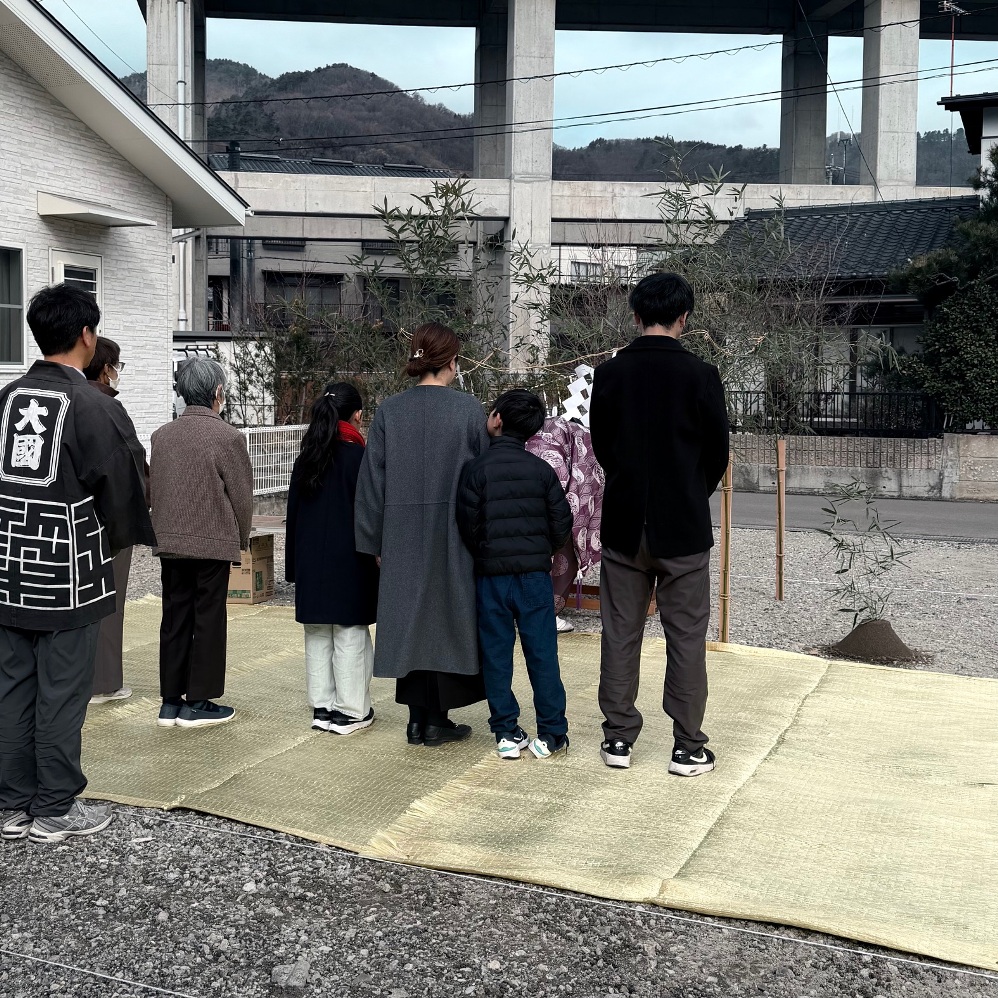 お施主様の親御様家族も神事にご出席いただき、お施主家族の普段の様子を垣間見ることもできました。私も前日よりご挨拶出来ることを楽しみにしておりました。お施主様家族のあたたかさを知ることができ、心穏やかな、あったかい地鎮祭となりました。